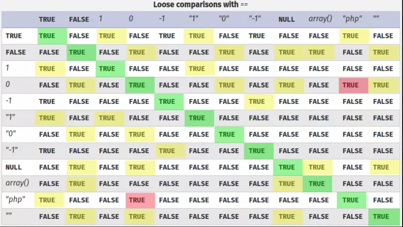 Dưới đay là bảng so sánh Loose comparison (Điều kiện để sảy ra Type Juggling)